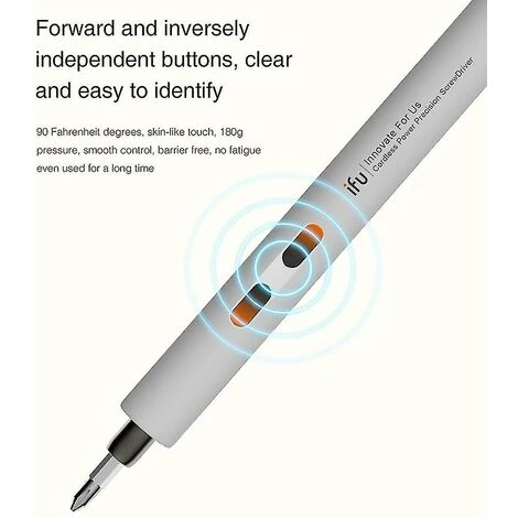 Caractéristiques Il s’agit d’un tournevis électrique compact et de précision, qui peut démonter des vis d’équipement de petite et moyenne taille telles que des produits électroniques numériques de téléphone portable ordinaires, des produits consommables informatiques et un modèle de cigarette électronique de drone modèle d’avion couteau pliant et de petits appareils électroménagers et certains équipements de précision, etc. Main dans une seule conception, non seulement le fonctionnement électrique, mais aussi le fonctionnement manuel, électrique et manuel peuvent être utilisés indépendamment ou en même temps. Tournevis électrique avec conception autobloquante, tant que le fonctionnement manuel, auto interne La serrure s’ouvrira automatiquement pour éviter les dommages au moteur, vous pouvez le faire fonctionner manuellement en toute sécurité. Moteur à balais de carbone de haute précision, vitesse de sortie de 200 tr/min lorsqu’il n’y a pas de charge pour répondre à la haute efficacité du vissage, sans perdre la contrôlabilité, la durée de vie du moteur soigneusement ajustée est suffisante pour enlever/installer plus de 30000 vis précises. Éclairage LED et conception de chargement du port USB, fournissant une puissance suffisante en temps opportun, un fonctionnement automatique et manuel desi gn, assure une efficacité de travail élevée. Le téléphone portable comme la charge, pas plus d’une heure pour être complètement chargé. Instruction avec lumière rouge lors de la charge. Avec une lumière bleue lorsqu’elle est complètement chargée, 360 sonne comme une indication, soyez clair en un coup d’œil. Remarque 1. S’il vous plaît selon le but, utilisez un tournevis électrique de taille appropriée. La sélection du tournevis électrique de taille appropriée rendra votre opération plus sûre et plus efficace.2. Veuillez ne pas appuyer sur deux boutons ou plus en même temps, ce qui pourrait endommager le circuit.3 . Veuillez ne pas mettre d’embouts ou d’autres éléments inappropriés dans l’alésage de l’arbre de sortie.4 . Veuillez ne pas faire fuir le tournevis électrique sous la pluie ou dans un environnement humide. L’eau ou tout autre liquide conducteur provoquera un court-circuit ou endommagera les pièces électriques. Manuel = 3 nm (couple de 30 kg) Alimentation Charge USB Source d’alimentation Batterie au lithium Paramètres de charge DC 5 V, plus de 500 mAH Temps de charge environ 40 minutes Voyant LED 3 près de l’alésage de l’arbre de sortie Vitesse nominale 200 tr/min Temps de veille entièrement chargé 180 jours Carton d’emballage Poids du produit 55 g Poids de l’emballage 137 g Taille du produit 16,7 * 0,16 * 0,16 cm / 6,57 * 0,06 * 0,06 poTaille du paquet 17 * 6 * 2 cm / 6,69 * 36 * 0,79 poListe des colis 1 * Tournevis électrique 1 * Câble USB 1 * Magnétiseur et gomme magnétique 1 * Tige d’extension 18 * Embouts de tournevis